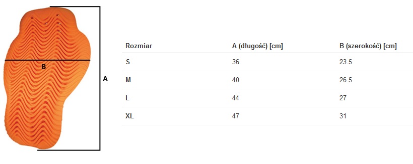 Wymiary protektora, z podziałem na poszczególne rozmiary: